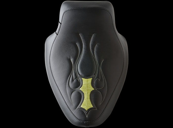 The Inferno Inlay shown features embossed pistachio gator on our Silhouette Solo with leather seating MSRP $458.00