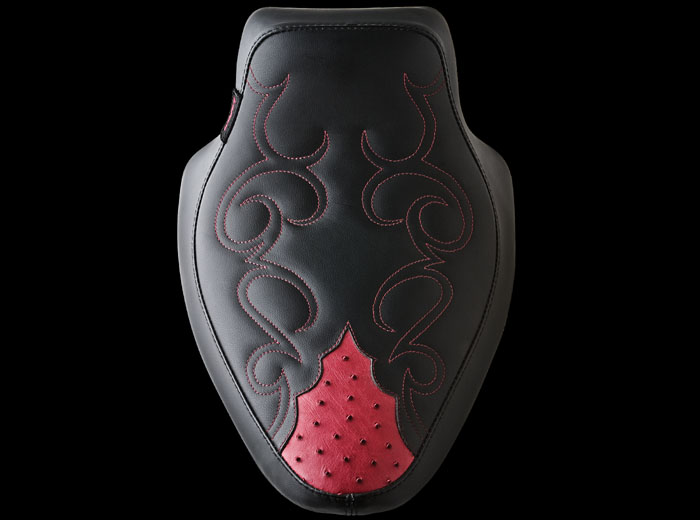 The Boot Cut Inlay shown features genuine red ostrich on our Silhouette Solo with leather seating MSRP $483.00.